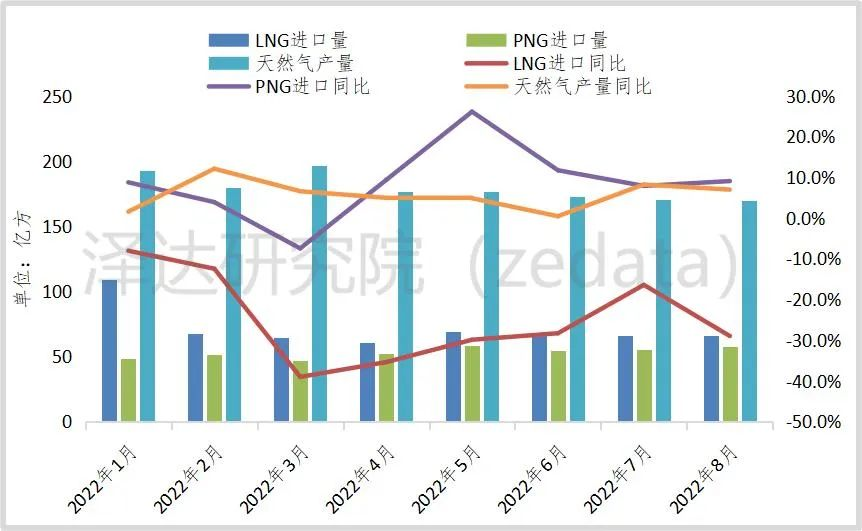 2022年1-8月,天然气消费量为2423亿方,同比上升0.79%,天然气进口量999亿方,同比下降13.63%,对外依存度为41.22%,其中LNG进口总量为572亿方,同比下降24.92%。PNG进口量为425亿方,同比上升8.47%。2022年1-8月,天然气产量1437亿方,同比上升5.29%。整体来看,由于国际LNG价格高企,国内需求低迷,中国液化天然气进口商一直在向欧洲出售过剩库存,并从销售中获得巨额利润,因此LNG进口量大幅减少,PNG进口量和天然气产量小幅增长,供需处于紧平衡状态。具体情况如图所示: